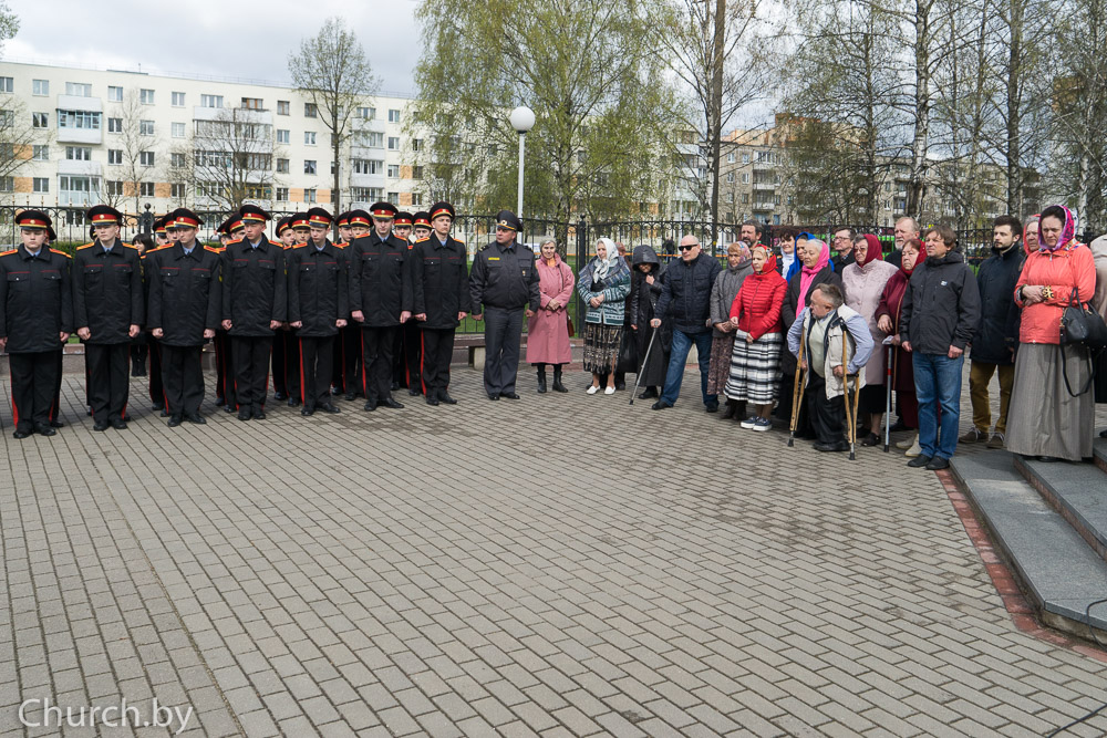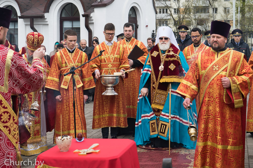 Перед богослужением, на площади перед храмом, Патриарший Экзарх обратился с приветственным словом ко всем присутствующим, а затем совершил литию по жертвам Чернобыльской катастрофы. На молитве присутствовали: ликвидаторы аварии; заместитель Министра внутренних дел Республики Беларусь, Александр Петрович Барсуков; сотрудники Минского областного управления департамента охраны, сотрудники и курсанты Центра повышения квалификации и Специализированного лицея МВД, а также курсанты Института пограничной службы Республики Беларусь.