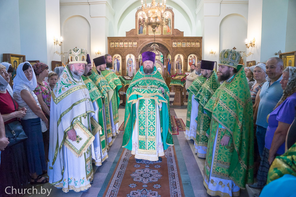 Его Высокопреосвященству сослужили: управляющий делами Минской Экзархии архимандрит Сергий (Брич); благочинный 4-го Минского городского церковного округа, настоятель прихода храма Всех Святых города Минска протоиерей Феодор Повный; настоятель храма протоиерей Александр Будько; секретарь Минской епархии протоиерей Андрей Волков и клирики прихода.