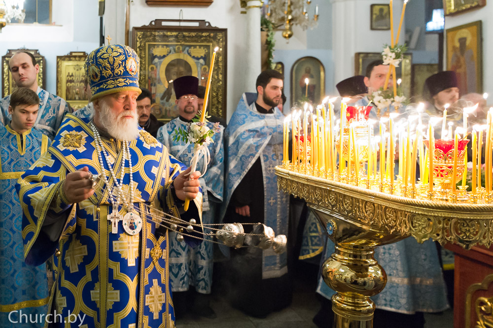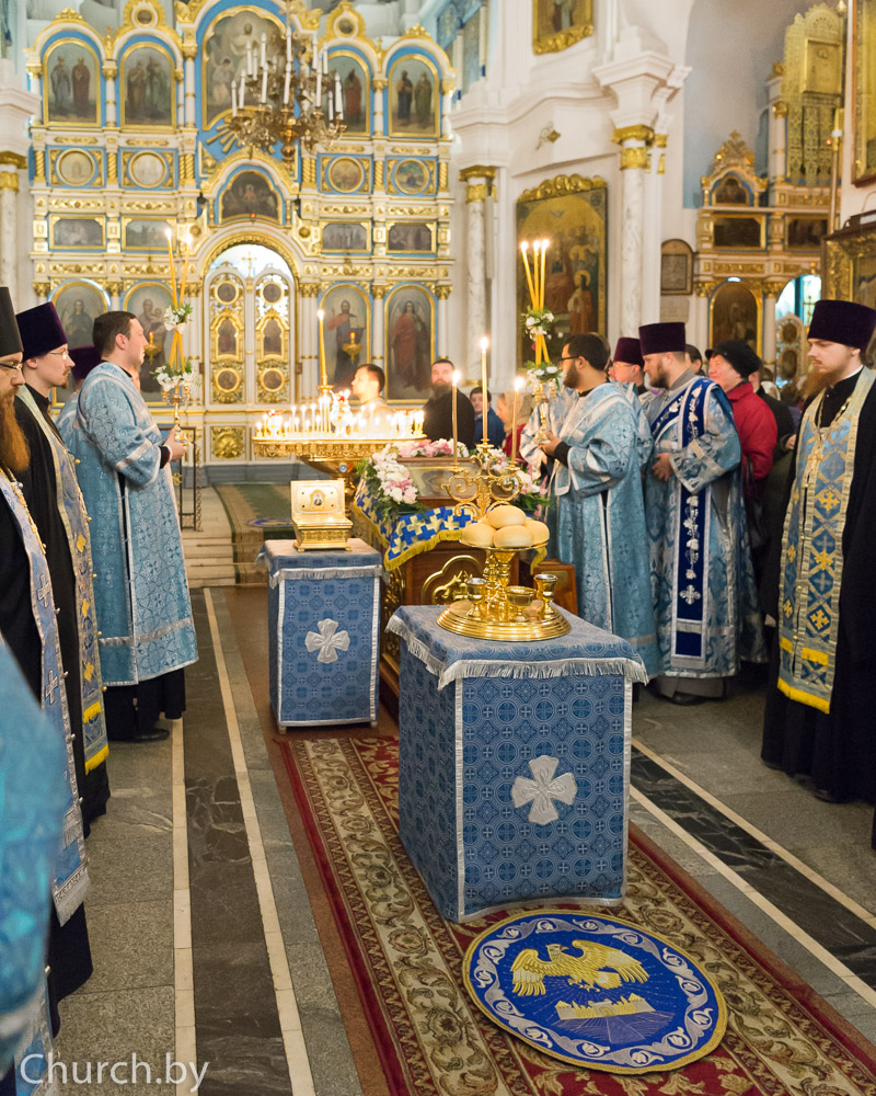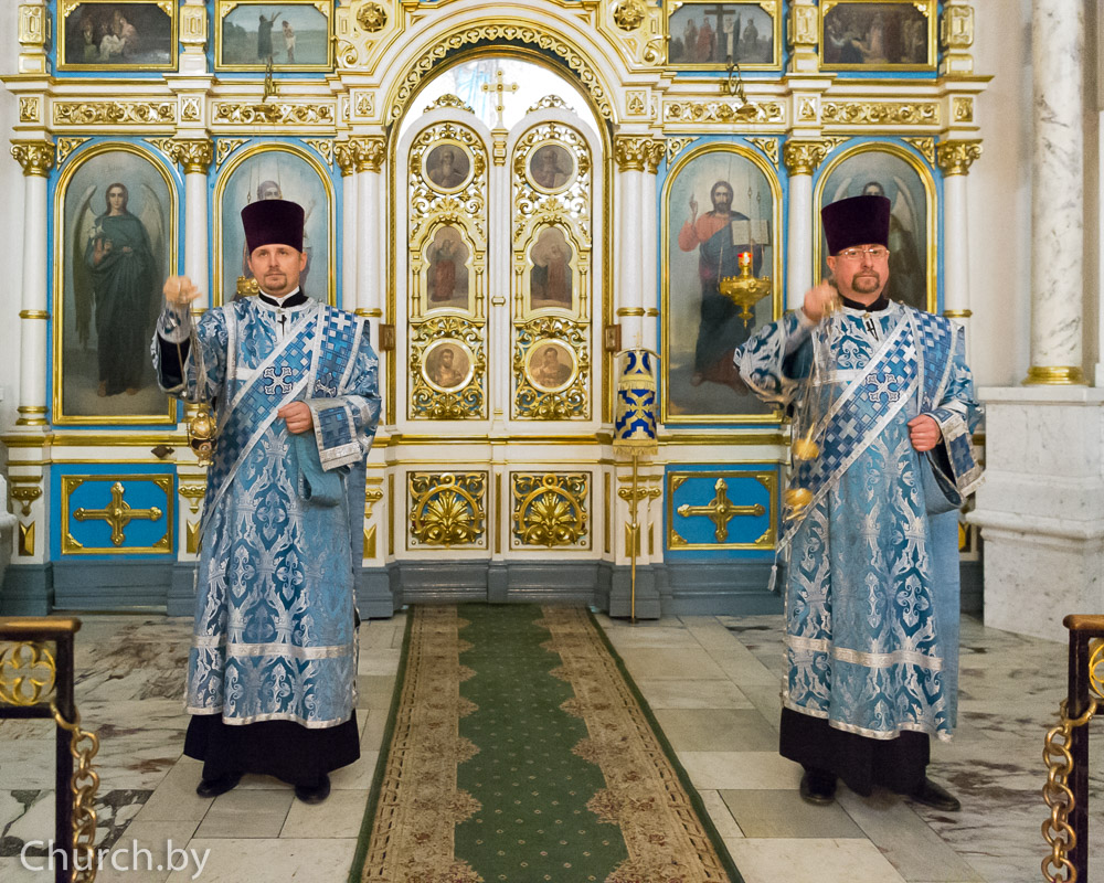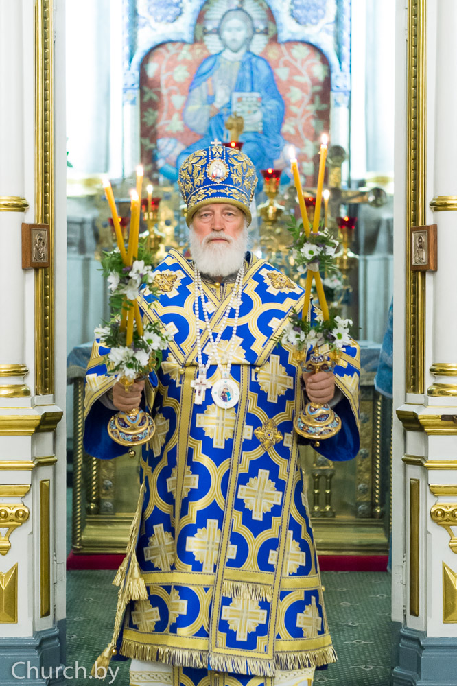 Его Высокопреосвященству сослужили: секретарь Минской епархии протоиерей Андрей Волков и клирики кафедрального собора.