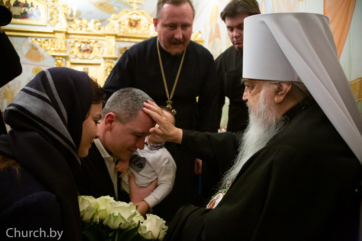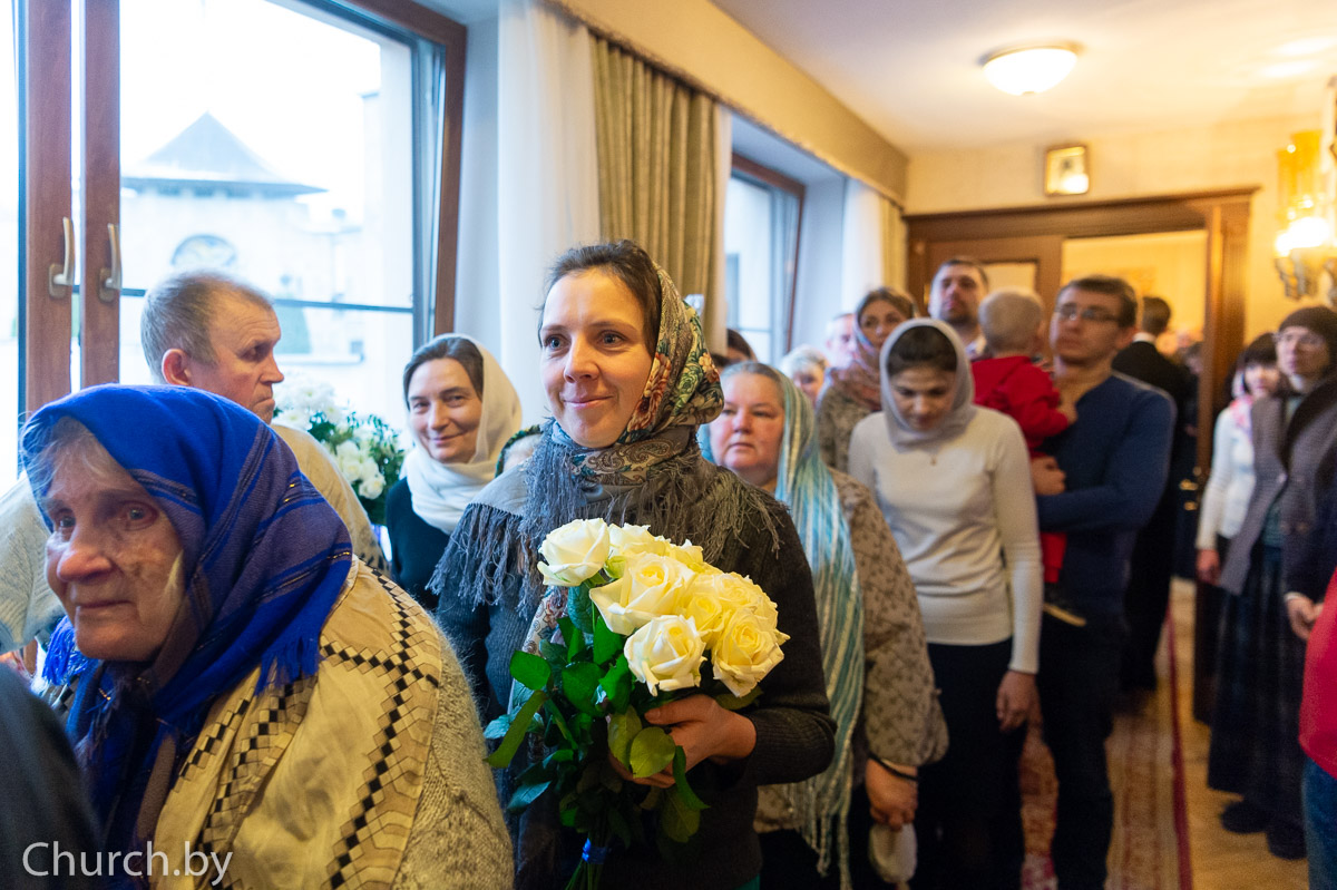 По завершении богослужения владыка Павел огласил поздравительный адрес Святейшего Патриарха Московского и всея Руси Кирилла и сердечно поздравил митрополита Филарета с днем Ангела от имени епископата, духовенства и верных чад Белорусской Православной Церкви. Почетному Патриаршему Экзарху были преподнесены святая просфора и букет цветов.