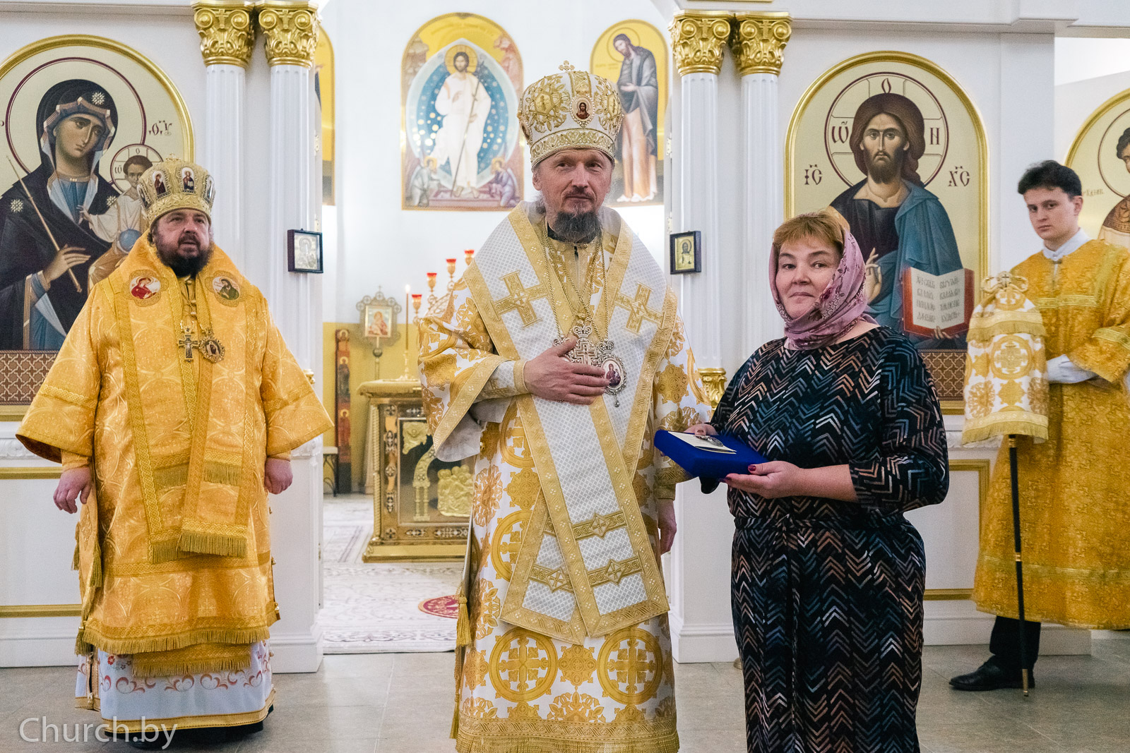 В завершение Митрополит Вениамин обратился к верующим с архипастырским словом, поздравил причастников с принятием Святых Христовых Таин и преподал всем благословение. Ответное слово произнес благочинный Несвижского церковного округа, настоятель прихода храма Вознесения Господня города Несвижа протоиерей Александр Данченко. Также Патриаршему Экзарху были преподнесены букет цветов и просфора; от лица отцов благочинных для храма был подарен набор для совершения Евхаристии.
