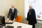 Подробнее о том, как люди с проблемами зрения осваивают IT-технологии, Патриаршему Экзарху рассказал мастер производственного обучения Александр Северин. Сам Александр Владимирович — полностью незрячий человек, но инвалидность не помешала ему получить два высших образования и стать успешным педагогом.