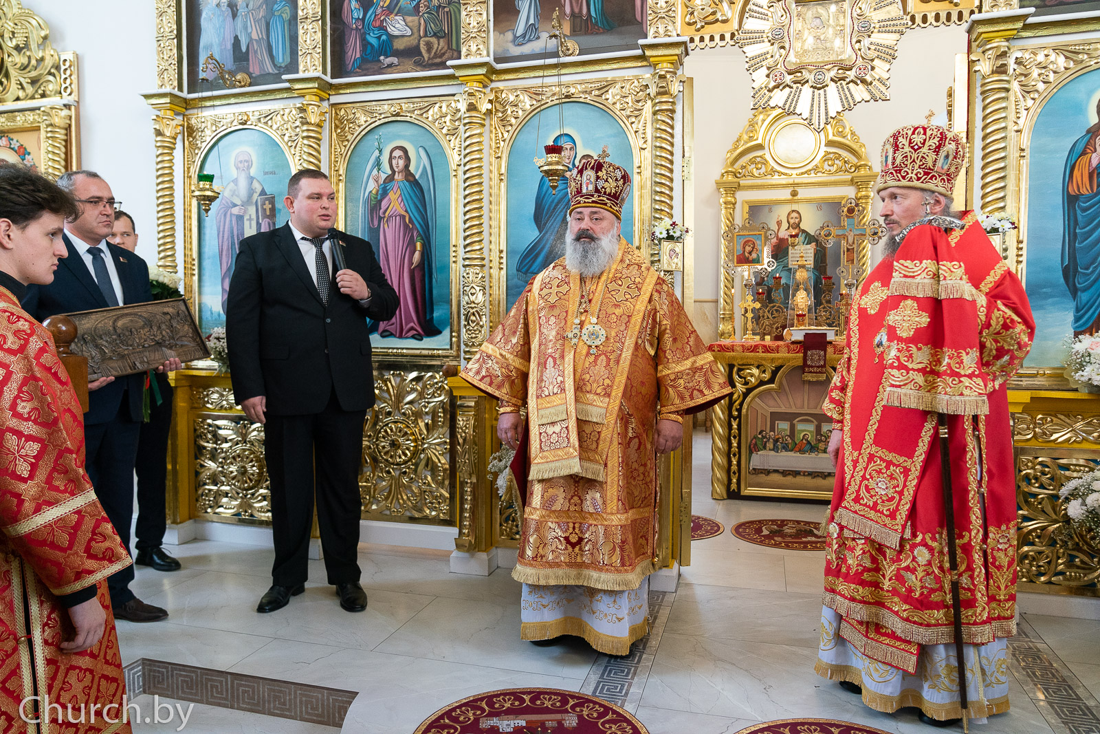Далее Митрополита Вениамина поприветствовал заместитель председателя Столинского районного исполнительного комитета Силивоник Денис Иванович, который от имени руководства исполнительного комитета преподнес Его Высокопреосвященству в дар резную икону из дерева «Тайная вечеря».