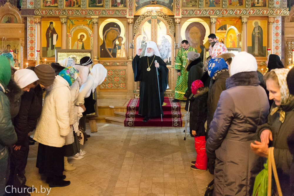 Его Высокопреосвященству сослужили: благочинный 5-го Минского городского церковного округа, настоятель прихода храма великомученика Георгия Победоносца города Минска протоиерей Александр Стреха; благочинный 7-го Минского городского церковного округа, настоятель прихода храма преподобного Серафима Саровского города Минска протоиерей Александр Ширитон; настоятель храма Преображения Господня города Минска протоиерей Святослав Левицкий; председатель Синодального отдела Белорусской Православной Церкви по тюремному служению, настоятель храма Введения во храм Пресвятой Богородицы города Минска протоиерей Георгий Лопухов; секретарь Минской епархии протоиерей Андрей Волков; настоятель прихода храма иконы Божией Матери «Всецарица» в городе Минске, председатель Синодального отдела по церковной благотворительности и социальному служению Белорусской Православной Церкви протоиерей Кирилл Шолков; настоятели храмов города Минска и клирики прихода.