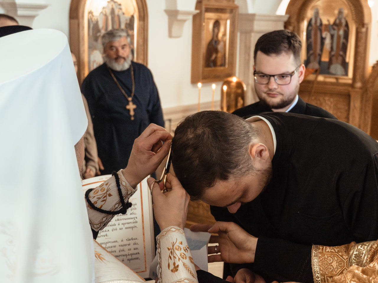 За богослужением состоялся постриг во чтецов Дмитрия Коляды, Виктора Партнова и Ильи Голобурды.