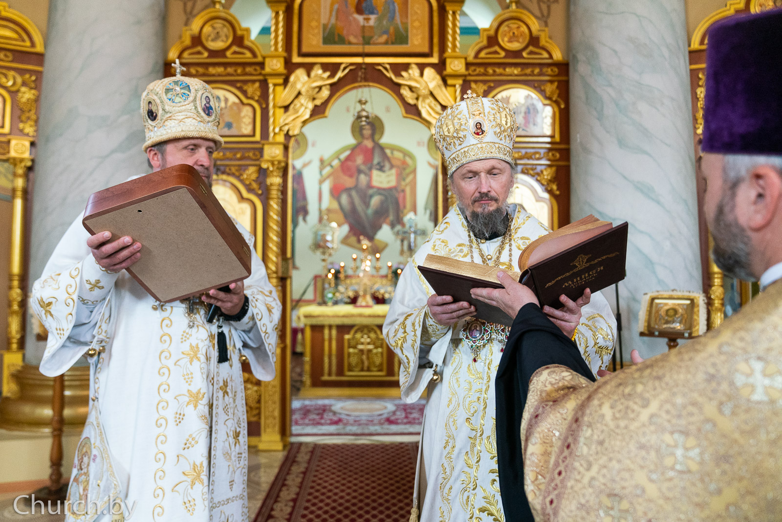 После полиелея епископ Порфирий поблагодарил Патриаршего Экзарха всея Беларуси Митрополита Вениамина за визит, который приурочен ко Дню белорусской письменности, и преподнес в дар икону Божией Матери «Живоносный Источник» и факсимильное издание самой древней из сохранившихся богослужебных книг — Минею 1724 года. Его Высокопреосвященство обратился к присутствующим со словом назидания, призвав к чтению Священного Писания и духовной литературы.