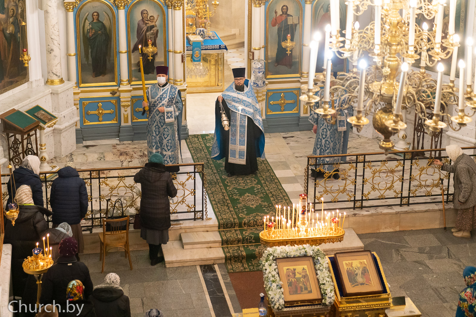 Его Высокопреосвященству сослужили: секретарь Минской епархии протоиерей Андрей Волков, ключарь собора протоиерей Владимир Уваров и духовенство собора.
