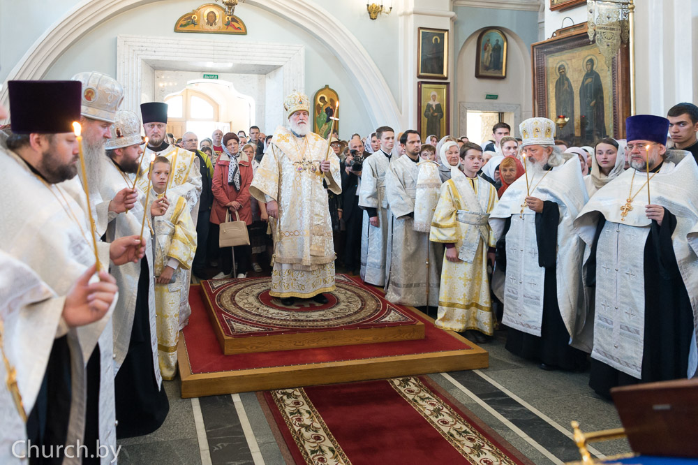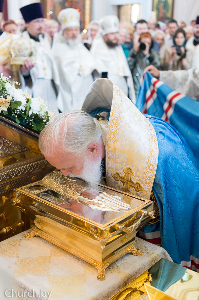 Перед началом богослужения в Свято-Духовом кафедральном соборе состоялась торжественная встреча ковчега с десницей святой преподобномученицы великой княгини Елисаветы Федоровны и с частицей мощей преподобномученицы инокини Варвары. Святые мощи принесены в город Минск из Знаменского Синодального собора города Нью-Йорка. В Минске ковчег будет пребывать до 22 мая.