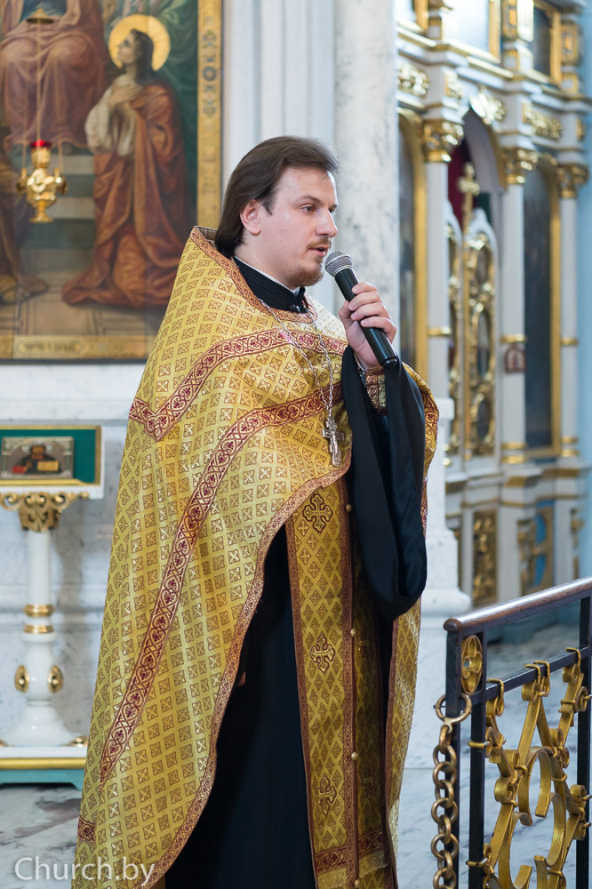 Его Высокопреосвященству сослужили: управляющий делами Минской Экзархии архимандрит Сергий (Брич); первый проректор Института теологии БГУ протоиерей Сергий Гордун; секретарь Минской епархии протоиерей Андрей Волков и клирики кафедрального собора.