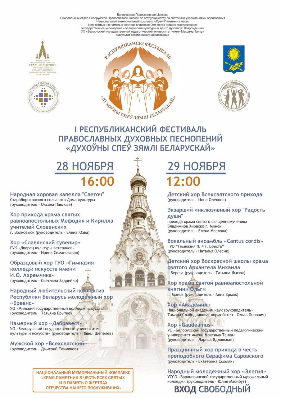 28–29 ноября 2025 года, по благословению Митрополита Минского и Заславского Вениамина, Патриаршего Экзарха всея Беларуси, в городе Минске пройдет I Республиканский фестиваль православных песнопений «Духоўны спеў Зямлі беларускай».