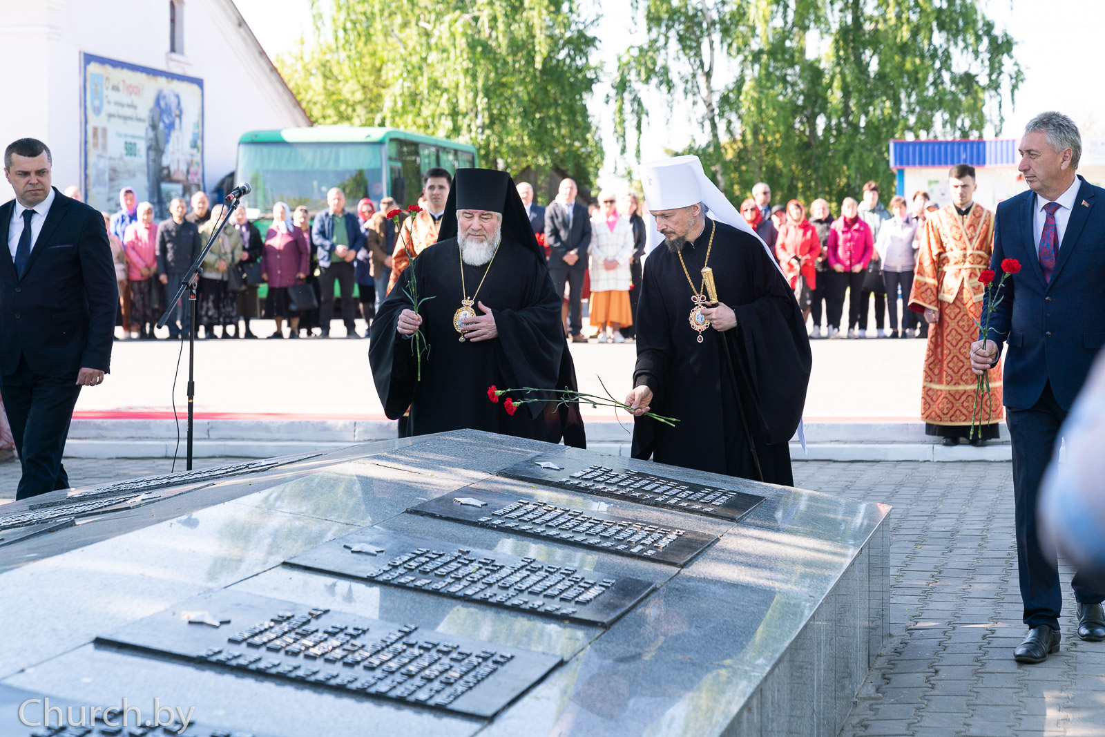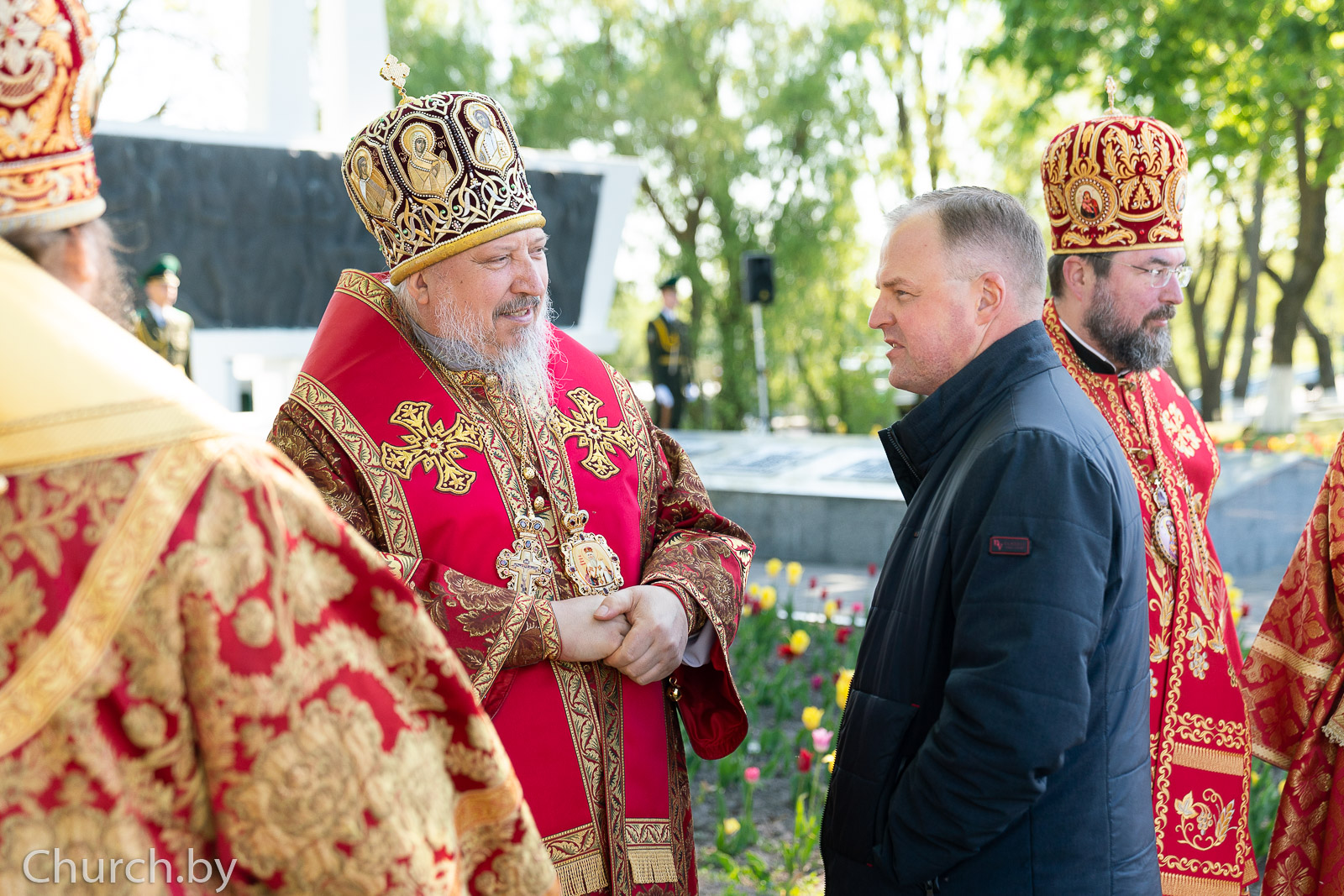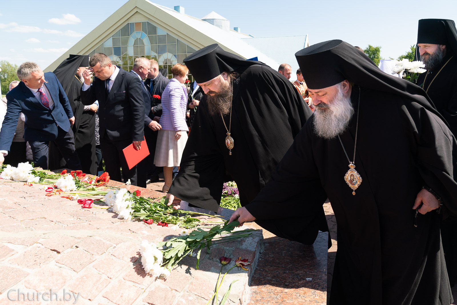 Епископат, духовенство, представители власти, прибывшие гости и паломники встречали Предстоятеля Белорусской Православной Церкви у памятника воинам Великой Отечественной войны, откуда крестным ходом проследовали к памятнику 1000-летия со дня основания Туровской епархии. К указанным памятникам Митрополит Вениамин вместе с преосвященными архипастырями возложил цветы, а у памятника воинам ВОВ после минуты молчания была провозглашена «Вечная память…».