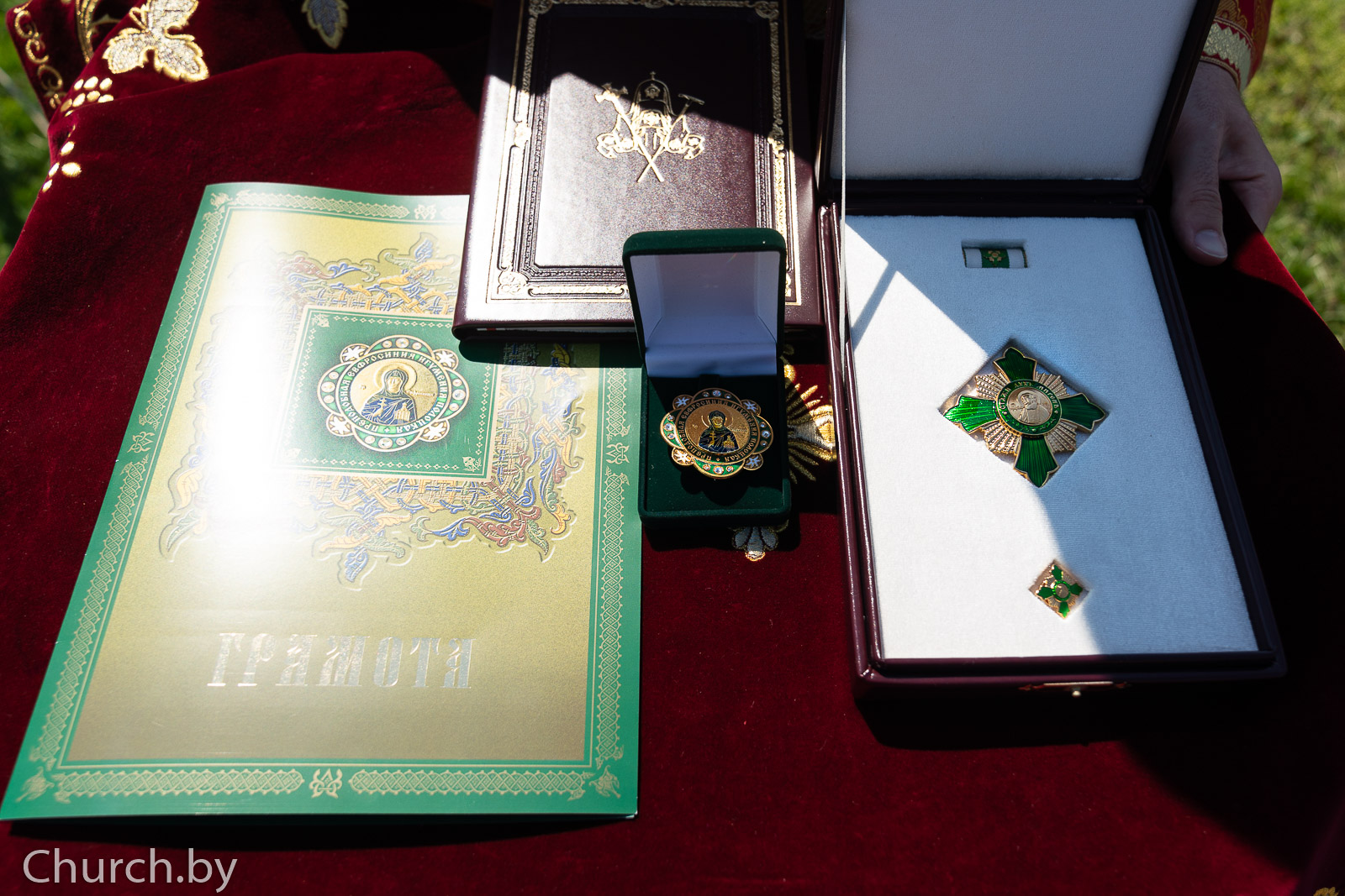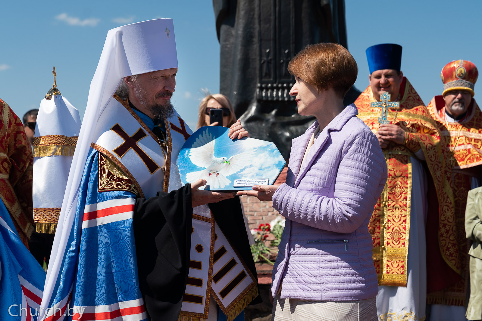 У памятника белорусскому Златоусту Митрополит Вениамин вручил Екатерине Зенкевич, председателю Гомельского областного Совета депутатов, орден святой преподобной Евфросинии Полоцкой.
