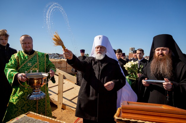 05 апреля 2020 ФоторепортажМитрополит Павел возглавил Литургию в храме в честь преподобного Паисия Святогорца города Слуцка, совершил закладку памятной грамоты в основание строящегося здания епархиального управления и освятил колокола для храмовой звонницы.