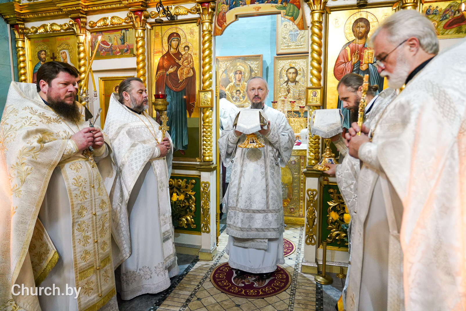 Его Высокопреосвященству сослужили секретарь Минской епархии протоиерей Андрей Волков и председатель Наградной комиссии Белорусского Экзархата иерей Дионисий Ковалев. На богослужении молились сотрудники Минского епархиального управления.