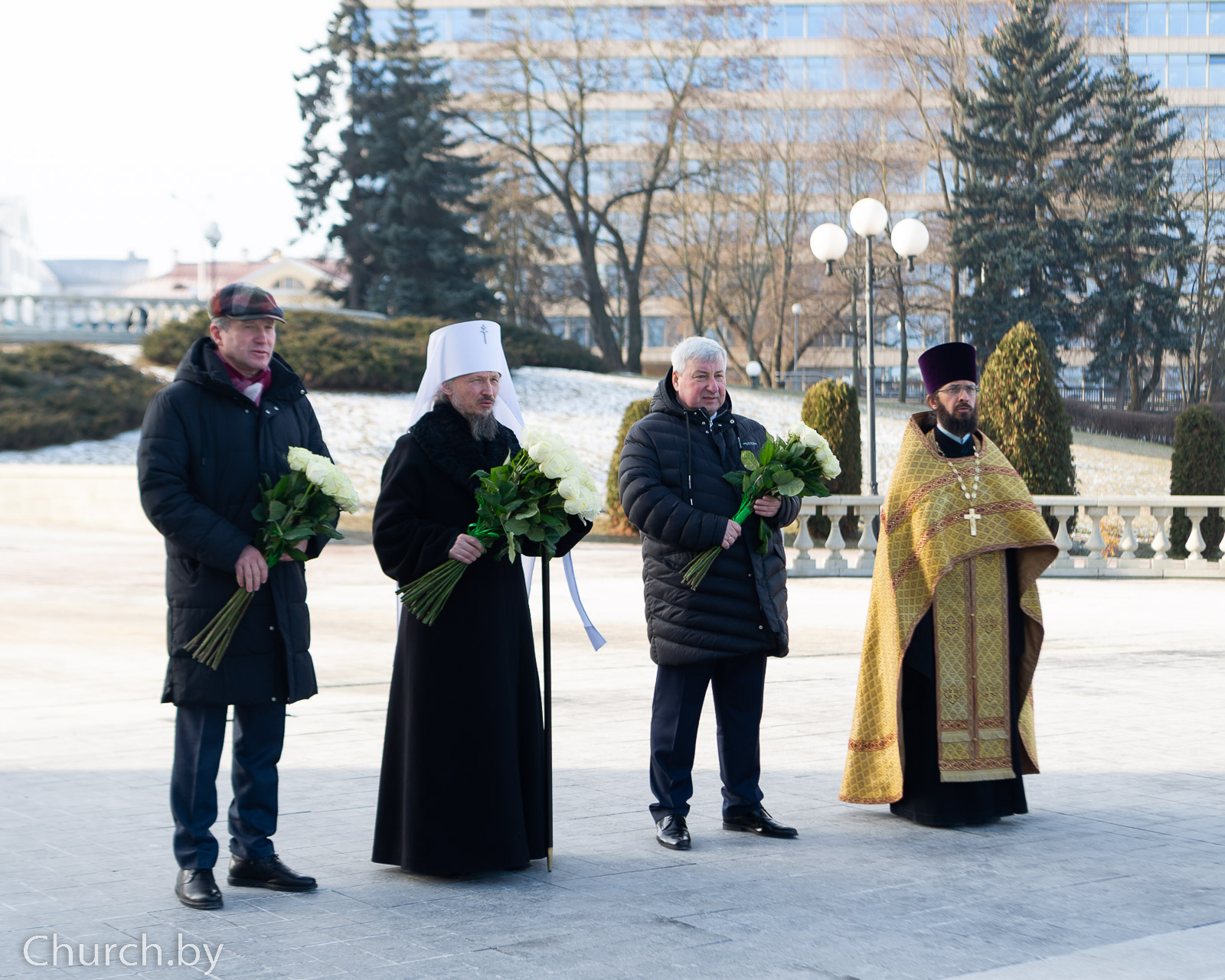В преддверии молебна Митрополит Вениамин вместе с присутствующими возложили цветы к памятнику первого Патриаршего Экзарха всея Беларуси Митрополита Филарета (Вахромеева).