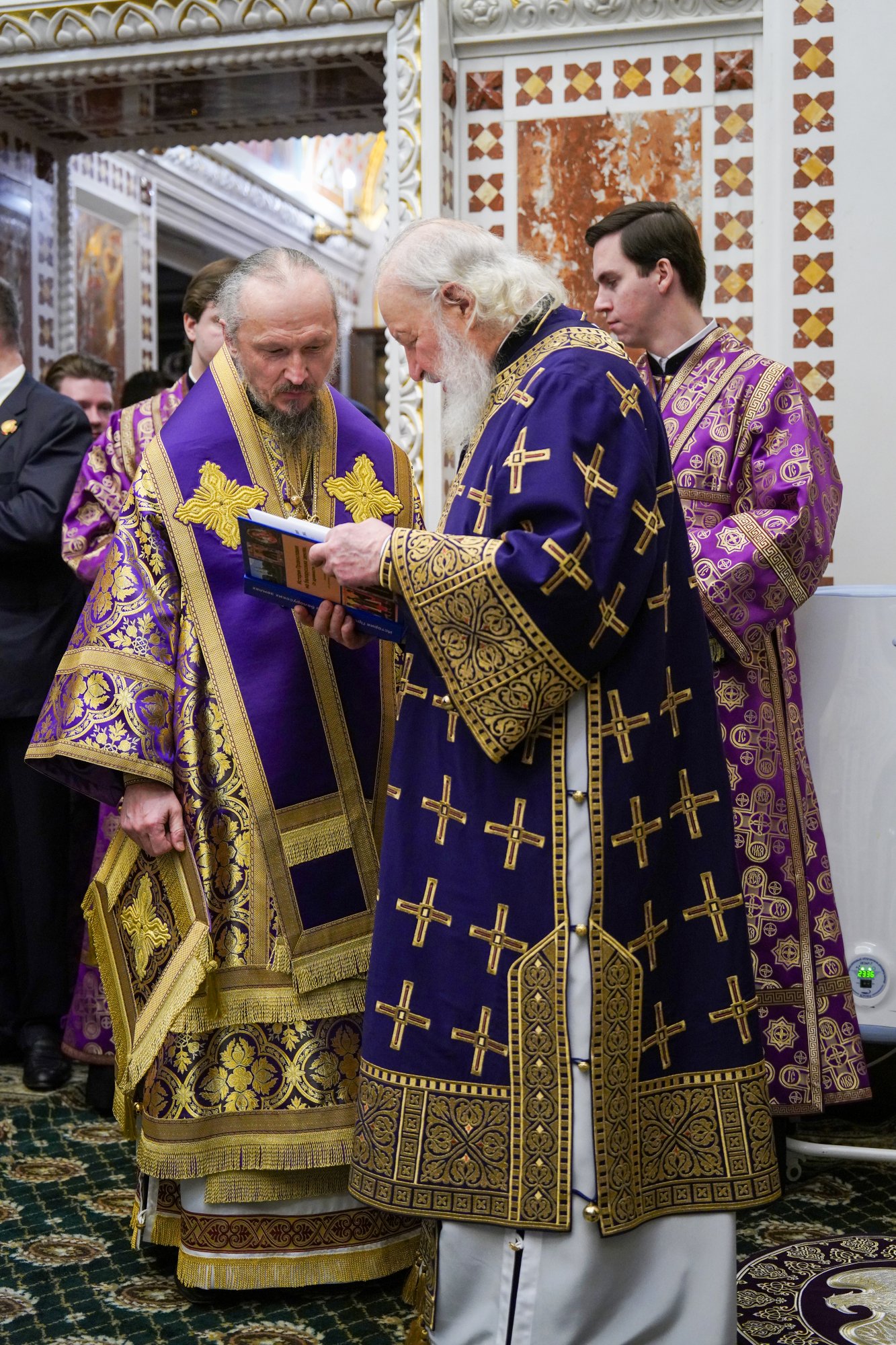 На сугубой ектении были вознесены особые прошения по случаю 50-летия со дня архиерейской хиротонии Святейшего Патриарха Кирилла, Митрополит Ювеналий (Поярков) прочитал молитву. Затем Предстоятель Русской Церкви прочитал молитву о Святой Руси.