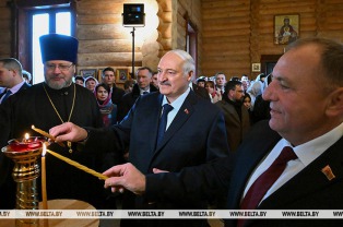 В храме глава государства традиционно зажег пасхальную свечу, пообщался с настоятелем протоиереем Романом Выговским и прихожанами.